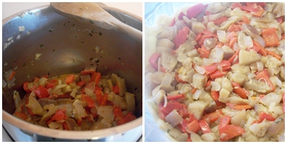 Pulite la melanzana e tagliatela a pezzi , fate lo stesso con i peperoni e la cipolla